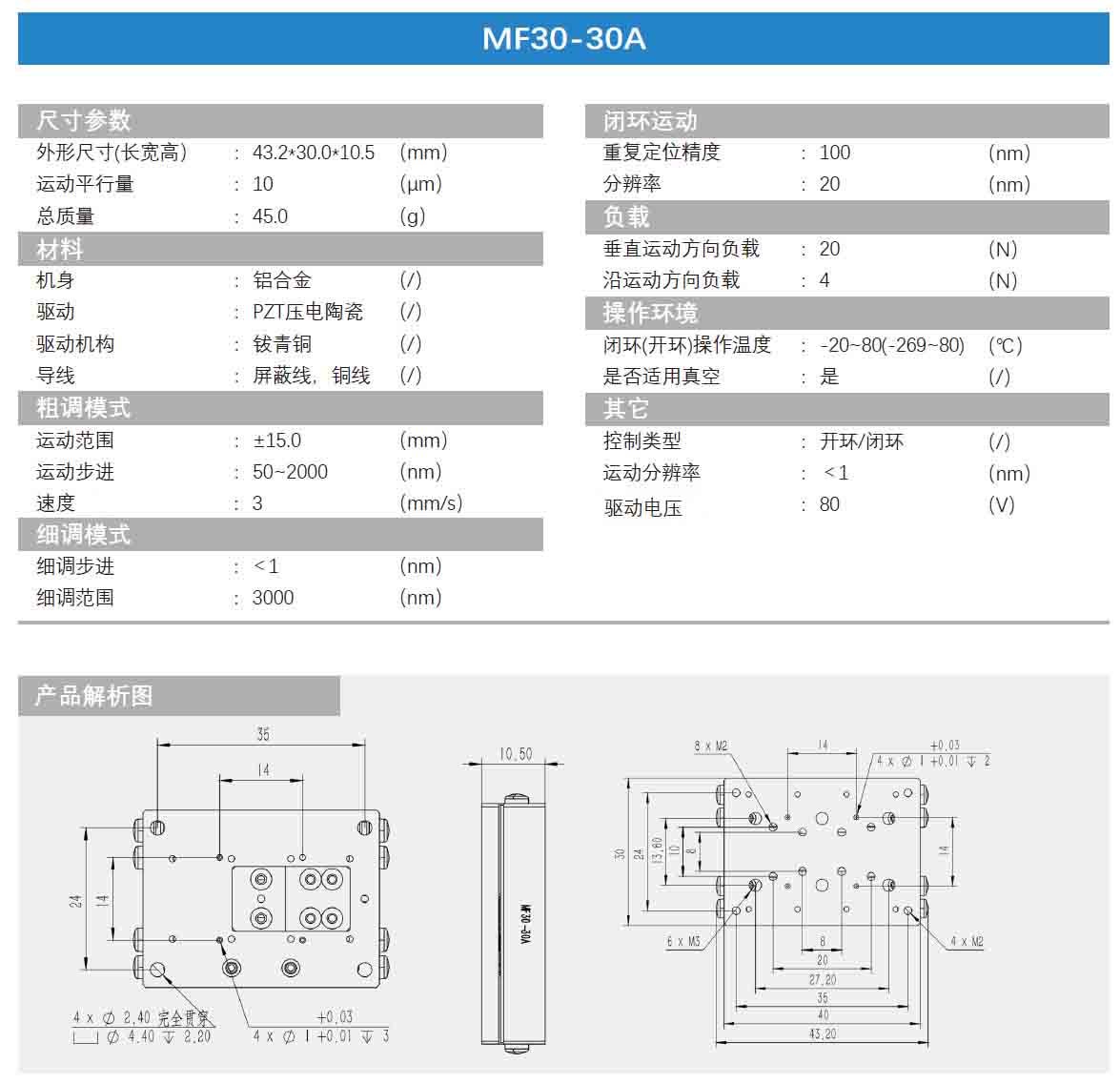 线性压电位移台-MF系列 MF30-30A技术参数